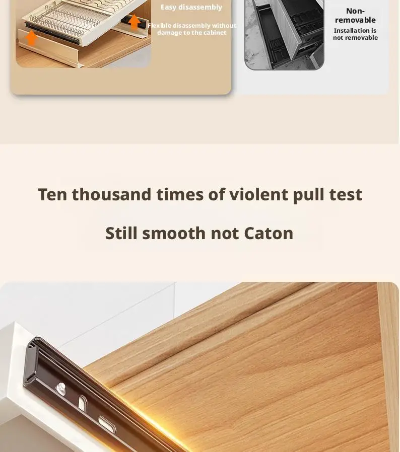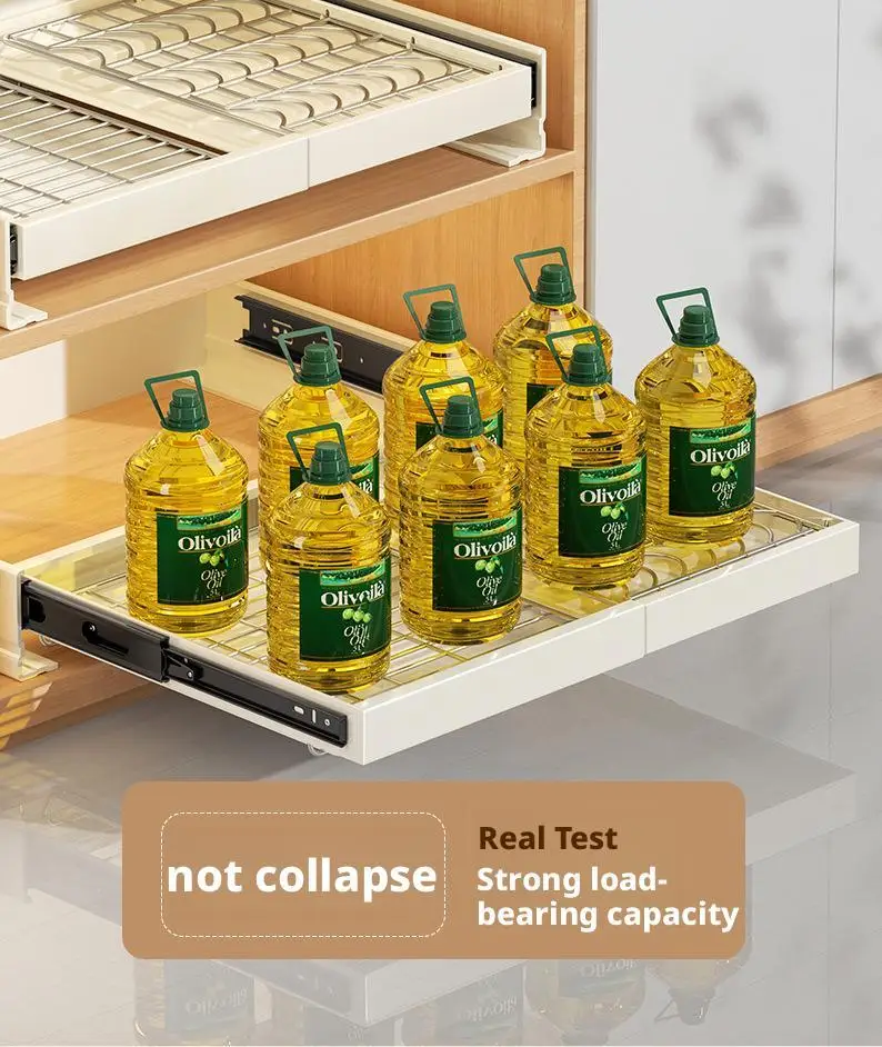 1,Sliding Drawer Pantry Shelf:Smooth and Quiet Sliding: Our slide out drawers for kitchen cabinets features a damping guide rail that has been rigorously tested for 40,000 cycles of opening and closing. This ensures that the shelf slides out smoothly and quietly, providing easy access to your items without any unpleasant noise.